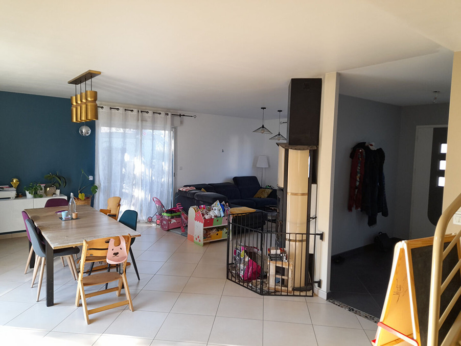 Pavillon récent composé de plain pied d'un salon séjour avec poêle, cuisine équipée, suite parentale, wc, à l'étage : mezzanine, trois chambres avec placards, sdb, wc, grenier aménageable ; grand garage, lingerie, cave, abri et terrain clos.